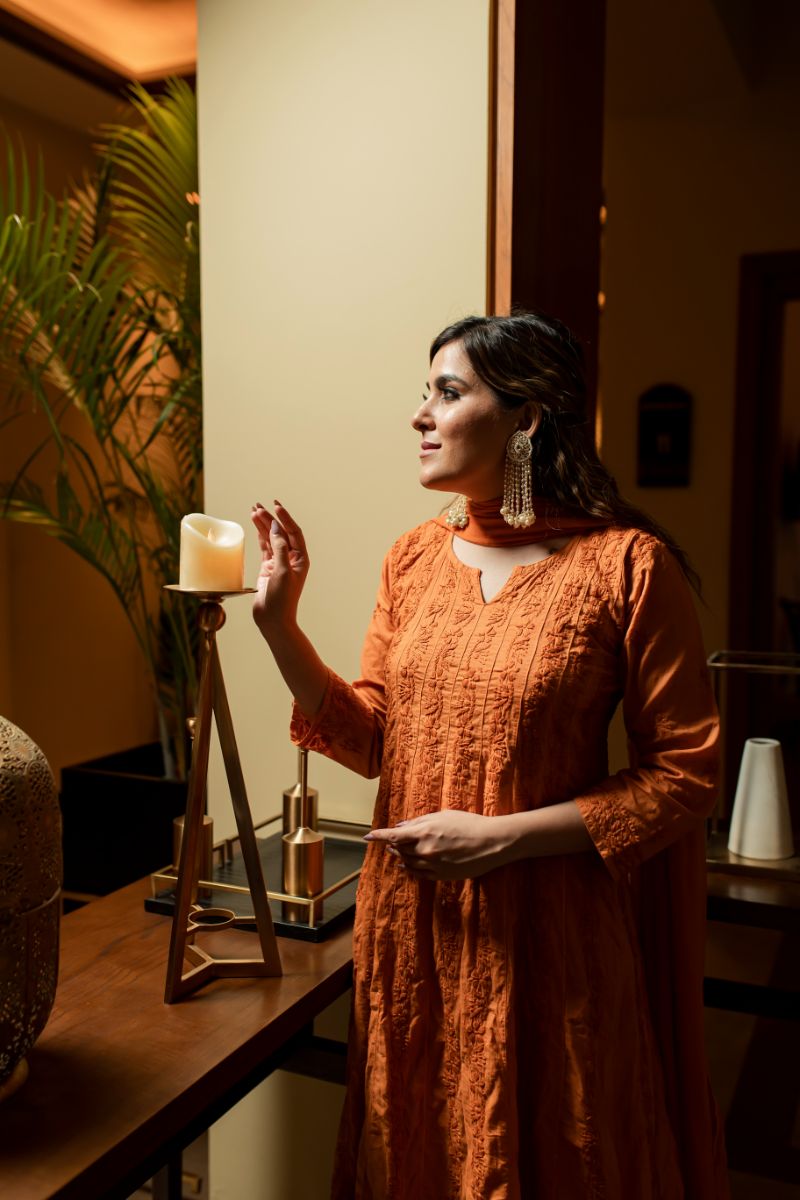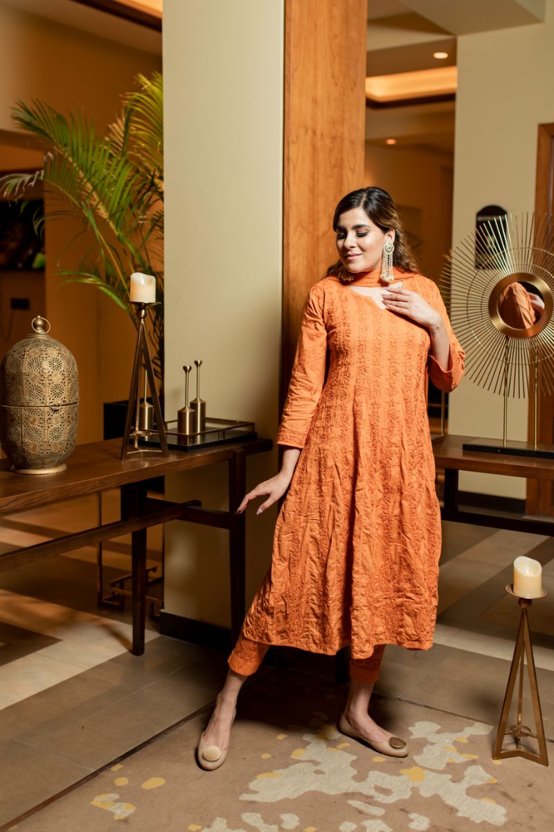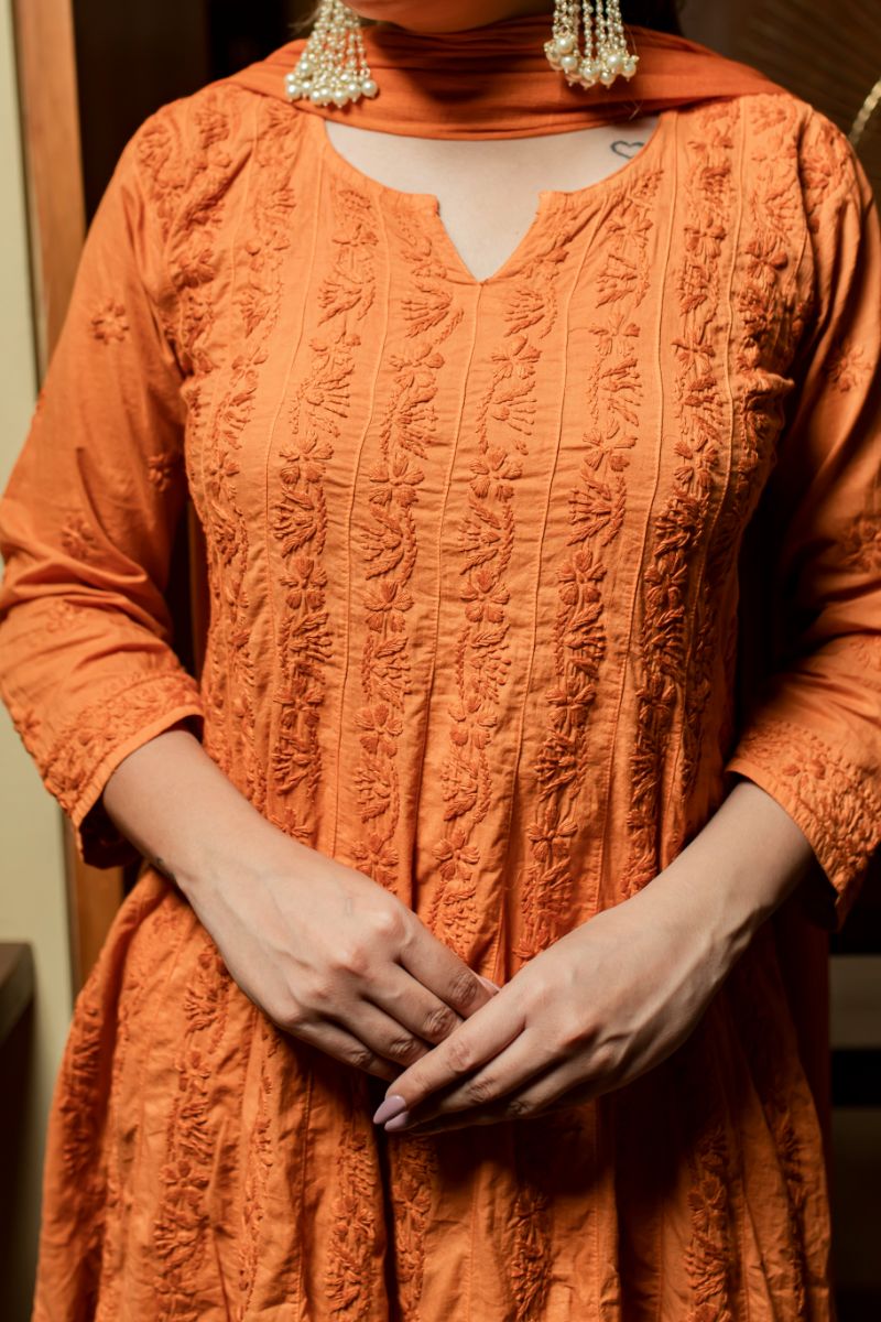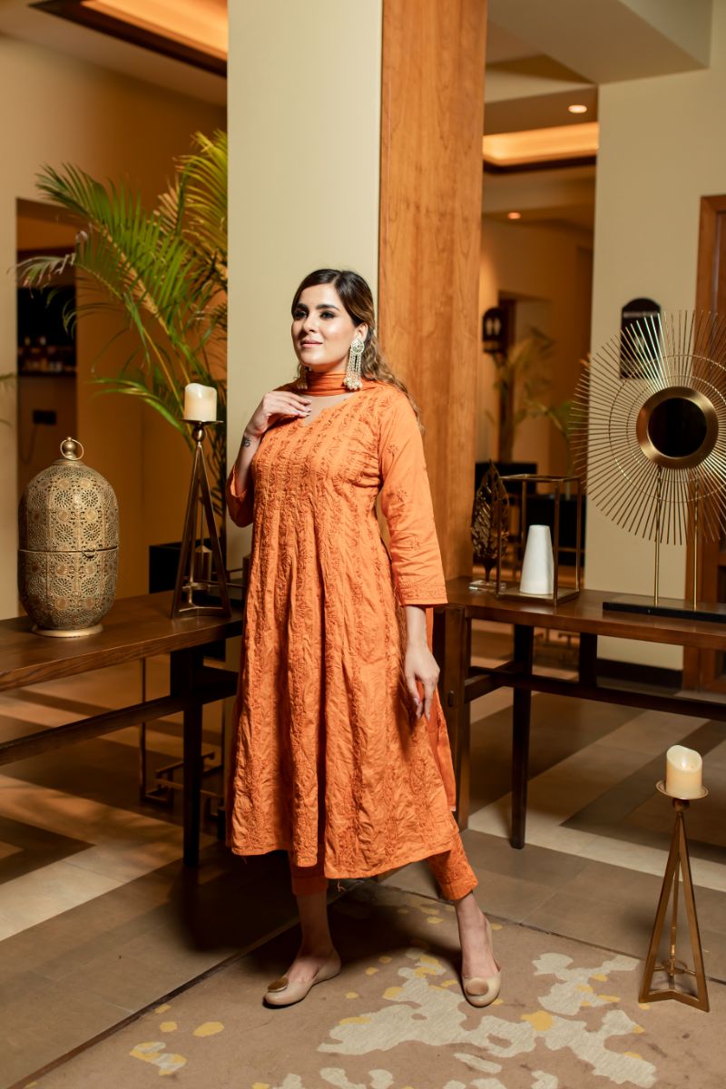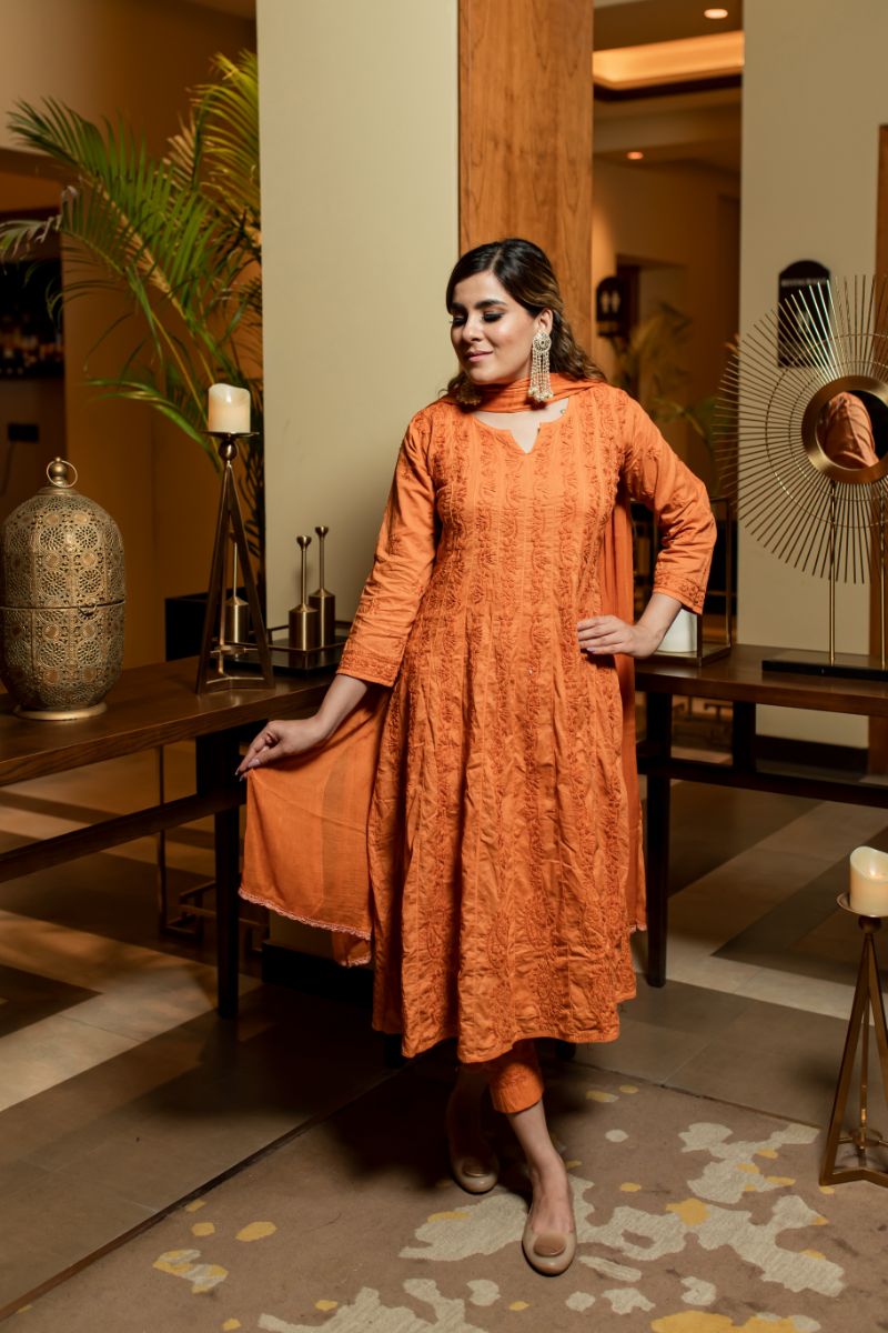 Cotton Anarkali, matching pant and dupatta Set is crafted in sumptuous Mulmul Cotton fabric, it has a luxuriously soft, lightweight feel that drapes beautifully. Perfect for special occasions, the set boasts a stylish and timeless silhouette that marks a refined, elegant look.