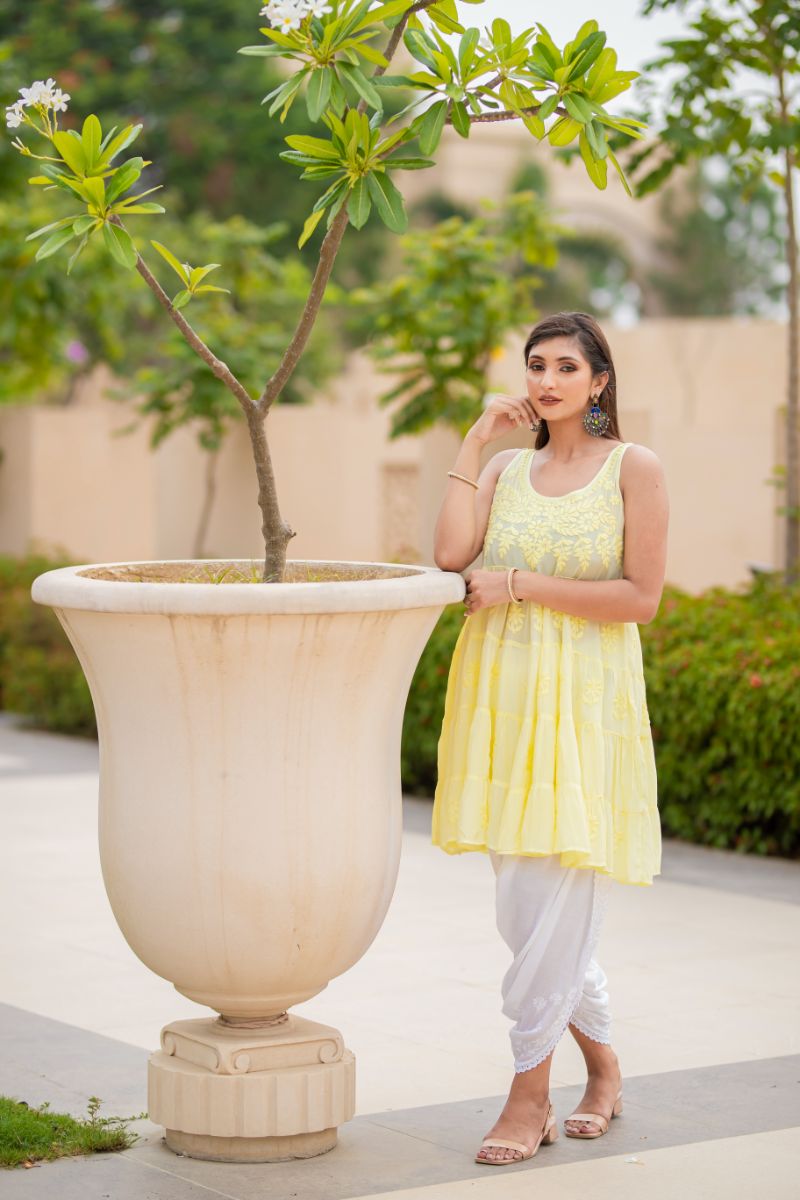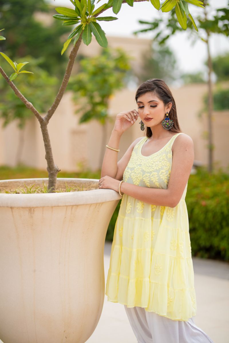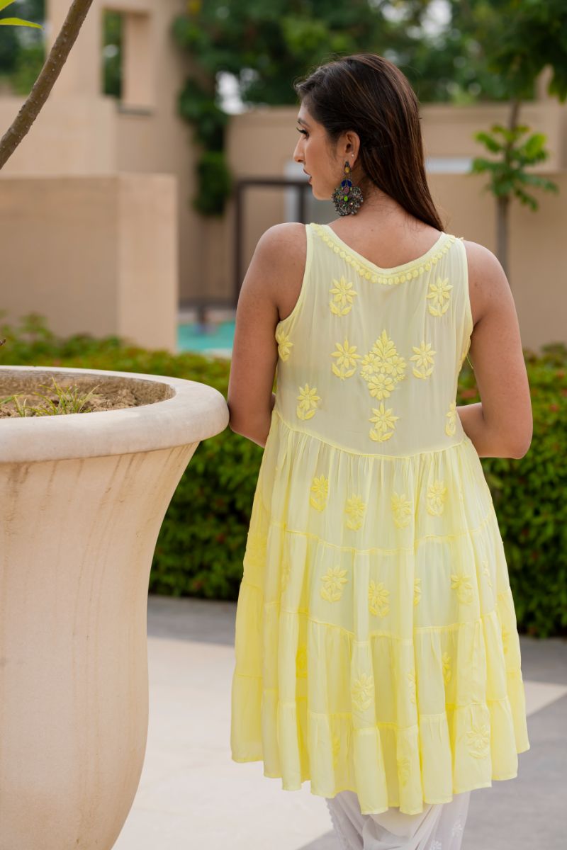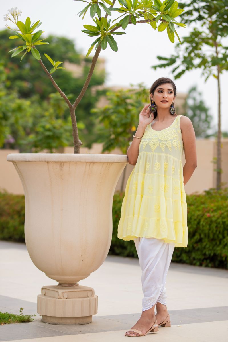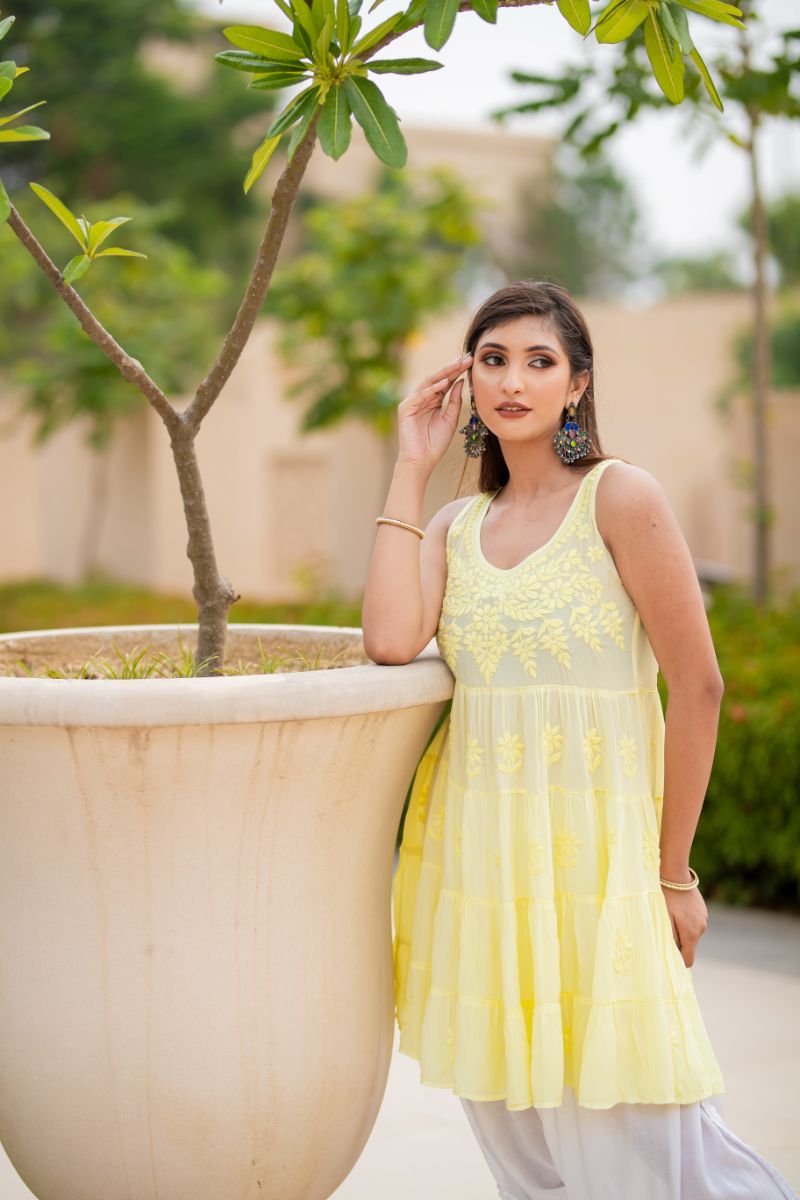Crepe sleevless tiered kurta is the perfect pick for the girls who likes a little bit of playful and quirky style. This cute kurta is guaranteed to make an impresssion