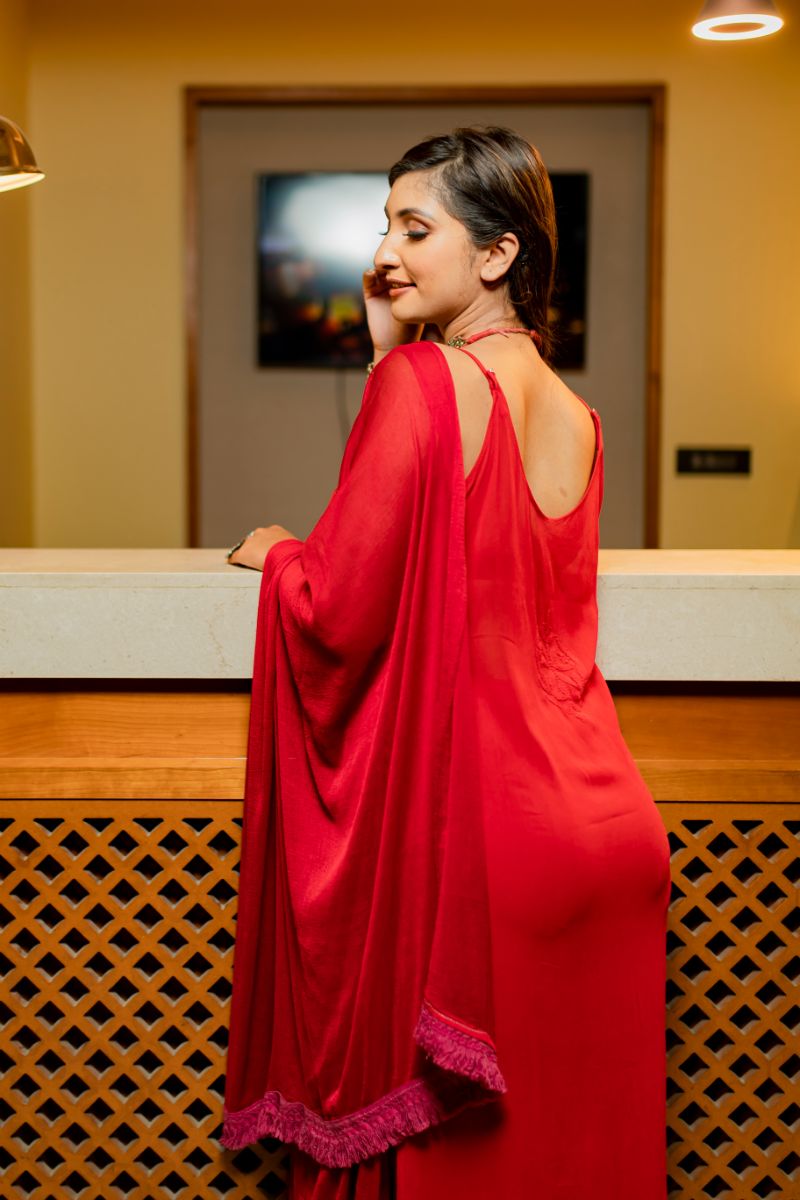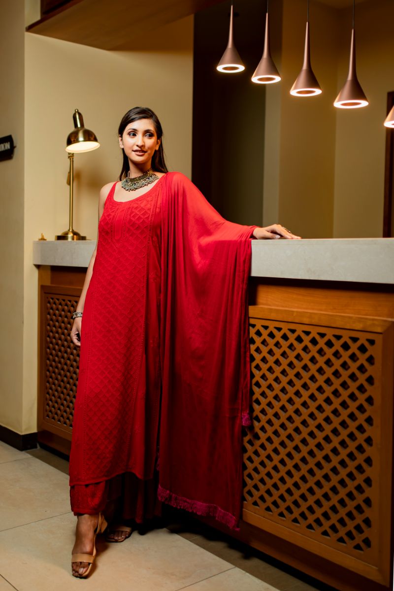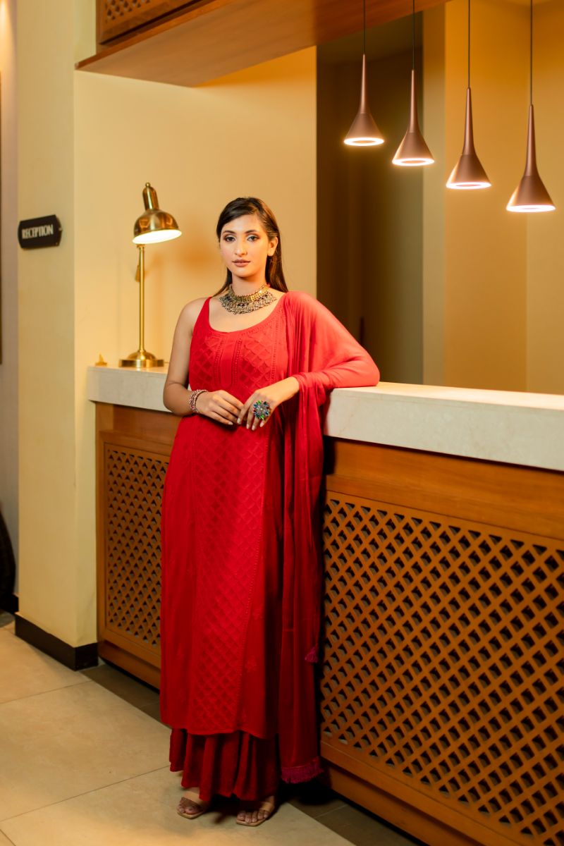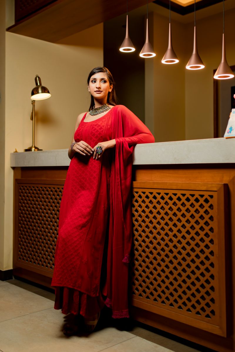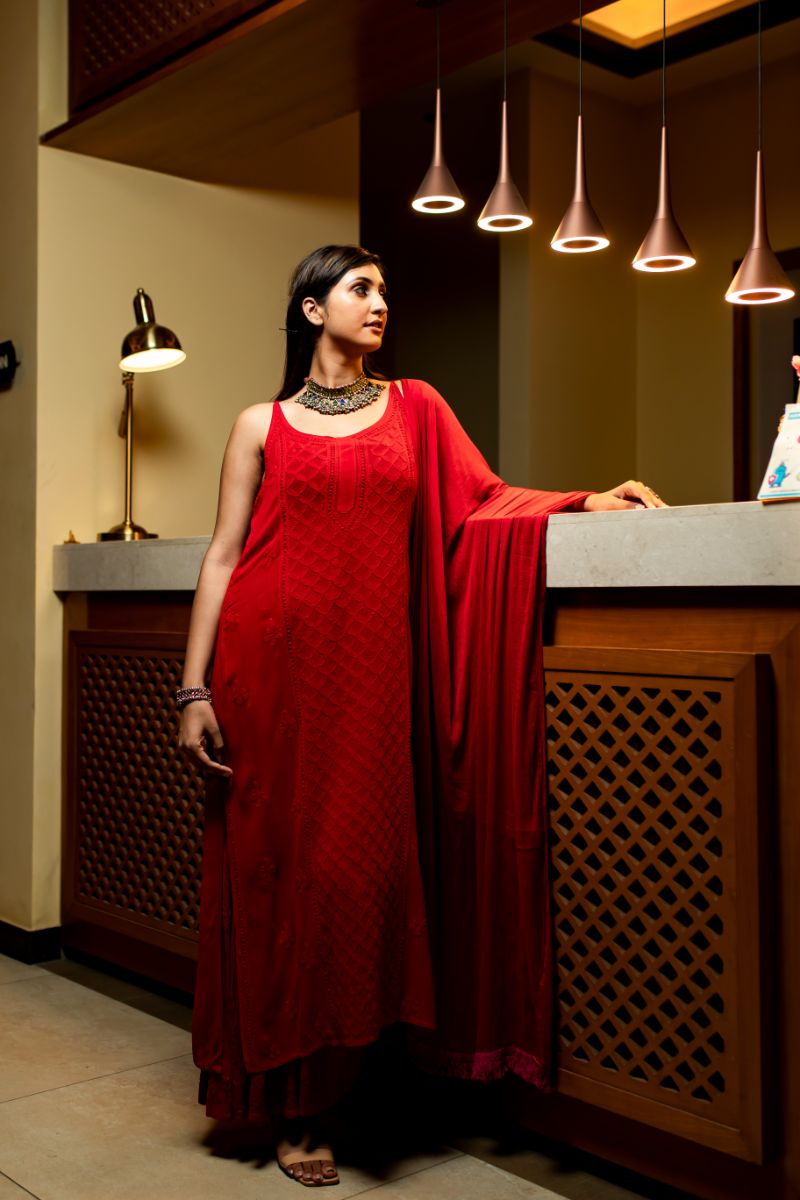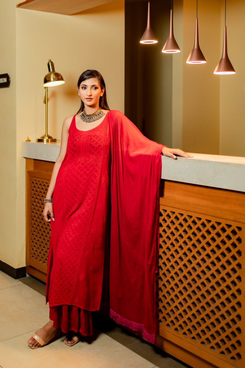 Noodle Strap long straight panel work kurta , sharara and dupatta set is crafted with a lightweight and airy georgette viscose fabric for superior breathability and comfort.This set provides a timeless , classic look that you can wear for any party/occasion
